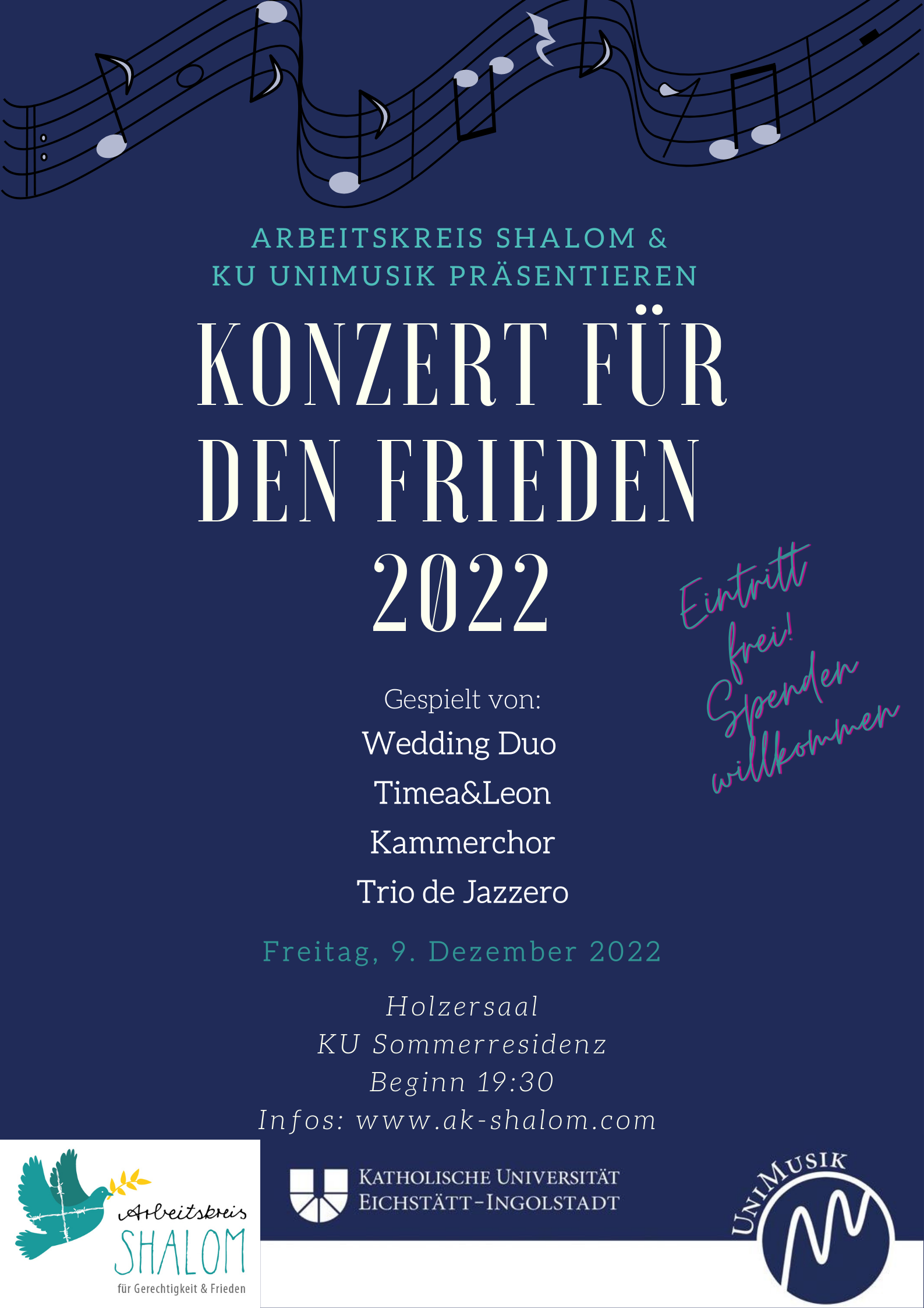 Im Rahmen der Shalompreis-Verleihung 2022 organisieren der Arbeitskreis Shalom und die Unimusik der Katholischen Universität Eichtsätt-Ingolstadt die Benefizveranstaltung „Konzert für den Frieden“. Das Konzert findet am Freitag, den 9. Dezember um 19:30 im Holzersaal der Sommerresidenz der KU Eichstätt-Ingolstadt statt.