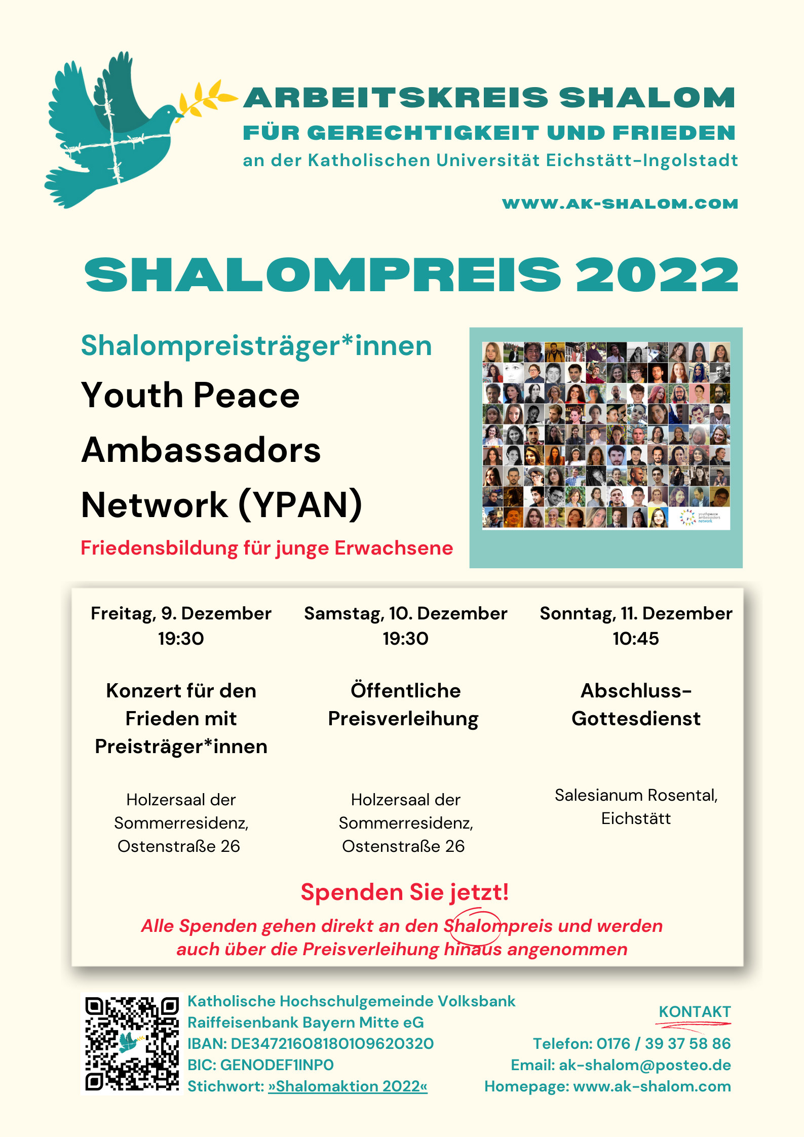 Das paneuropäische Friedensnetzwerk Youth Peace Ambassadors Network (YPAN) wurde am 10. Dezember 2022 mit dem Shalompreis ausgezeichnet. Das Preisgeld wird ausschließlich durch Spenden von Einzelpersonen und Institutionen, wie dem Referat Weltkirche des Bistums, der Oswald-Stiftung und dem Rotary Club getragen. Dieses Mal kam die Summe von 28.000 Euro zusammen.
