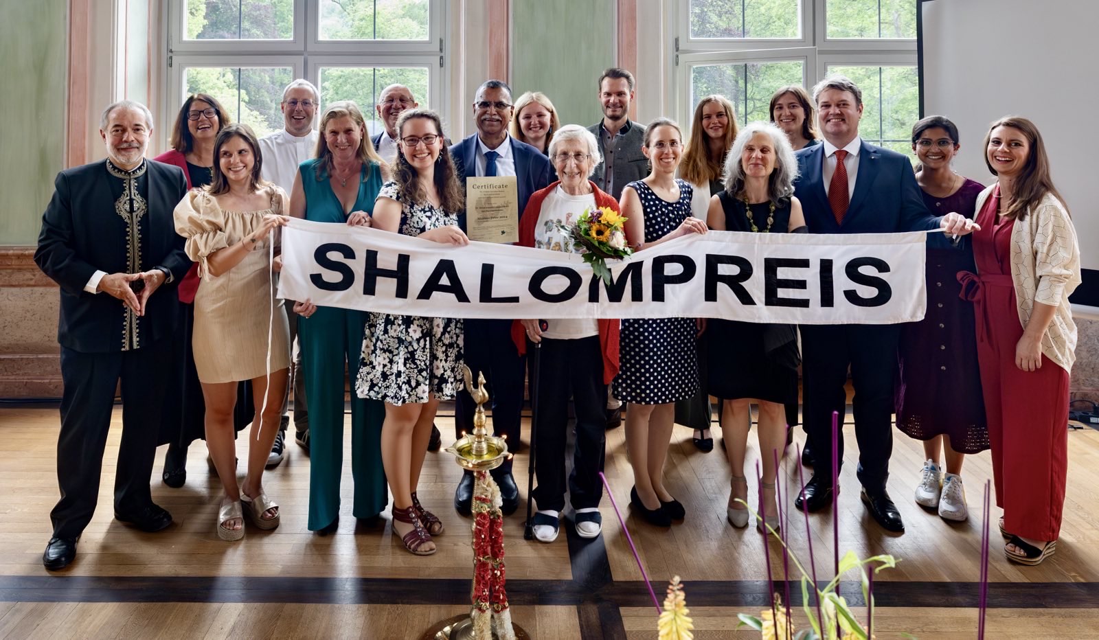In seinem Grußwort sagte der Schirmherr der Shalomaktion, Oberbürgermeister Josef Grienberger, wie wichtig ehrenamtliches Engagement sei. Das Recht auf freie Arbeitswahl sei ein hohes Gut. Die Präsidentin der Katholischen Universität Eichstätt-Ingolstadt erläuterte in einer Interviewsituation mit den beiden Moderatorinnen der Veranstaltung, was faire Universität heißt. Sie sprach vom Austausch der Studierenden, davon dass zum Beispiel Start-Ups von Absolventinnen in Ländern Afrikas durch die Förderung der Katholischen Universität entstanden seien. Die Universität kaufe Produkte, die unter fairen Bedingungen hergestellt worden seien. Der Leiter des Referats Weltkirche des Bistums Eichstätt, Gerhard Rott, begrüßte den Gast mit einer Blumengirlande. So wie er das bei seinen Besuchen in Indien jedes Mal erlebt habe. Das Bistum Eichstätt ist seit 1955 mit dem Bistum Pune partnerschaftlich verbunden. Seit vielen Jahren ist das Bistum Spender des Shalompreises. Rott entzündete mit dem Preisträger und Gästen eine Lampe des Friedens und erinnerte an die gemeinsame Verantwortung aller für diesen. Musikalisch durch den Abend begleiteten die Studentinnen Angelina Kwoczalla, Gesang und Ulrike Hofbeck am Klavier.