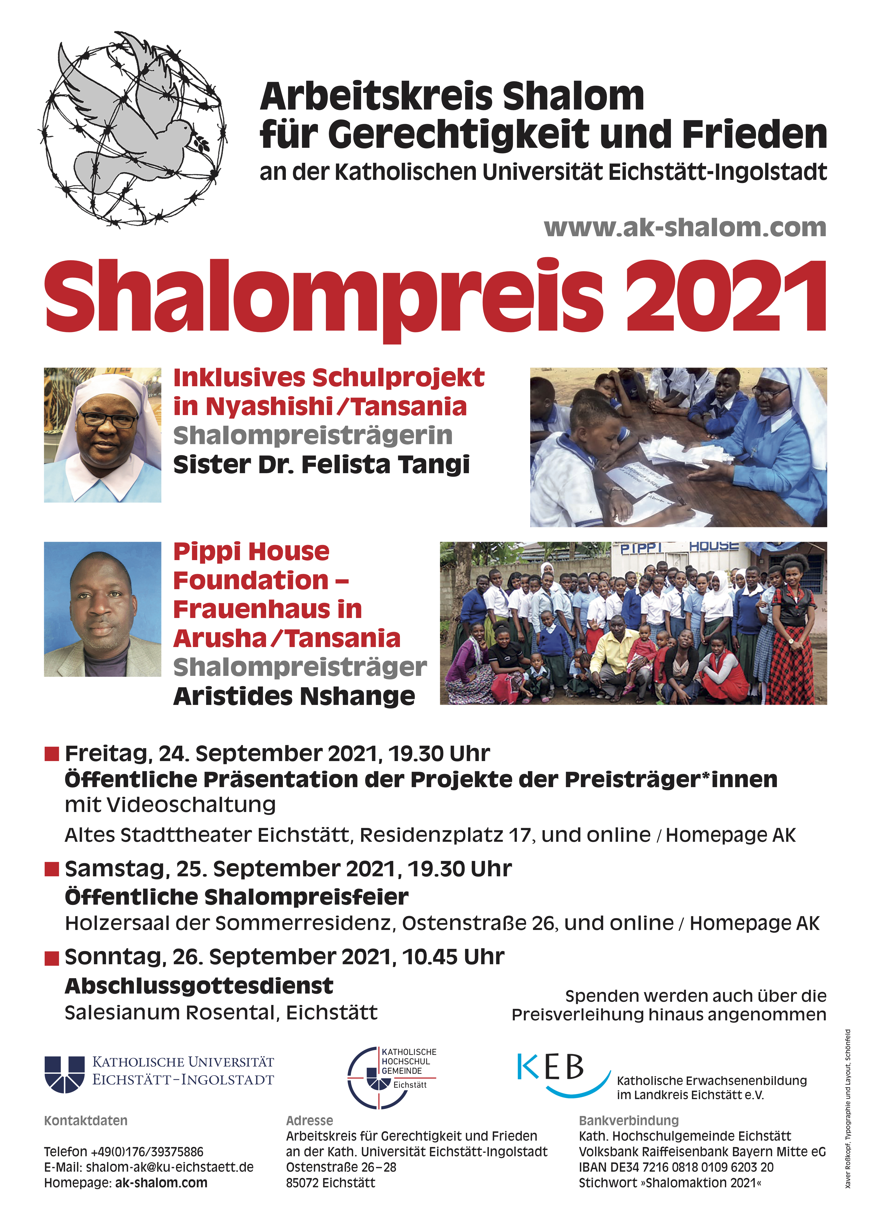Der AK Shalom für Gerechtigkeit und Frieden verleiht in diesem Jahr, dem vierzigsten seines Bestehens, den Shalompreis an zwei beeindruckende tansanische Projekte: Preisprojekt 1: Projekt zur Bekämpfung von Schulgewalt in Tansania in den Regionen Rulenge-Ngara und Mwanza und Preisprojekt 2: Pippi House for Girls in Arusha.